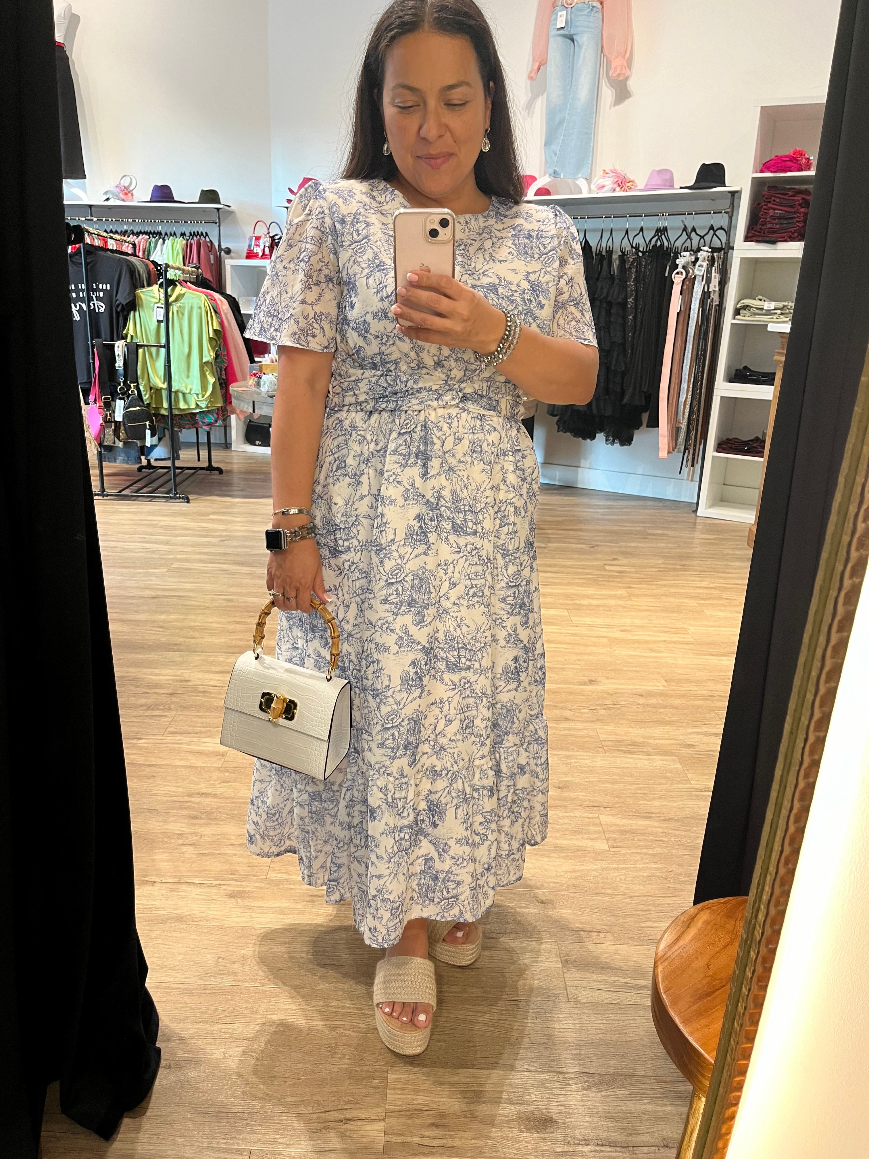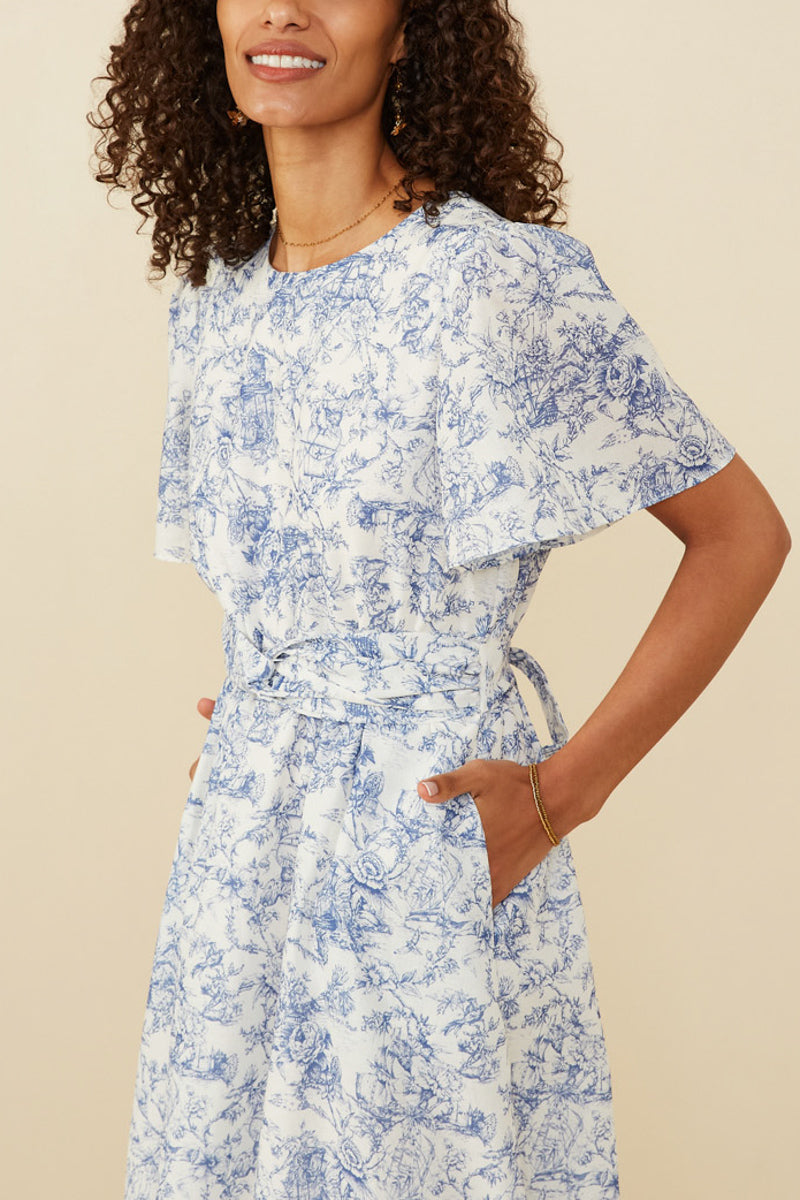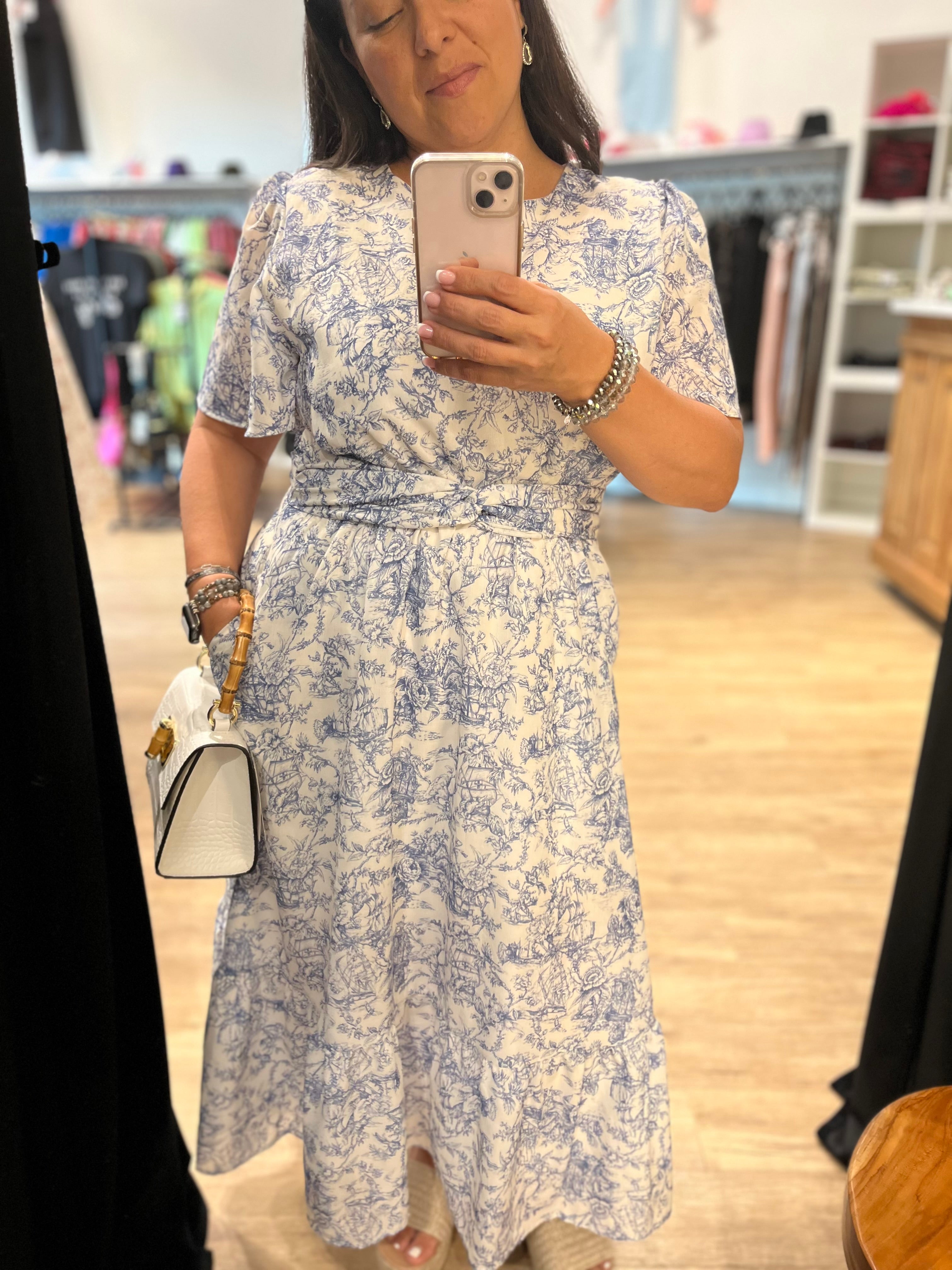 Effortlessly elegant, the Georgia Grace Dress exudes vintage charm with its antique floral print and maxi length. The feminine petal sleeves and twist waist tie add a touch of romantic sophistication, while the practical pockets and full lining make it both stylish and functional. Available in a chic white and blue color palette.