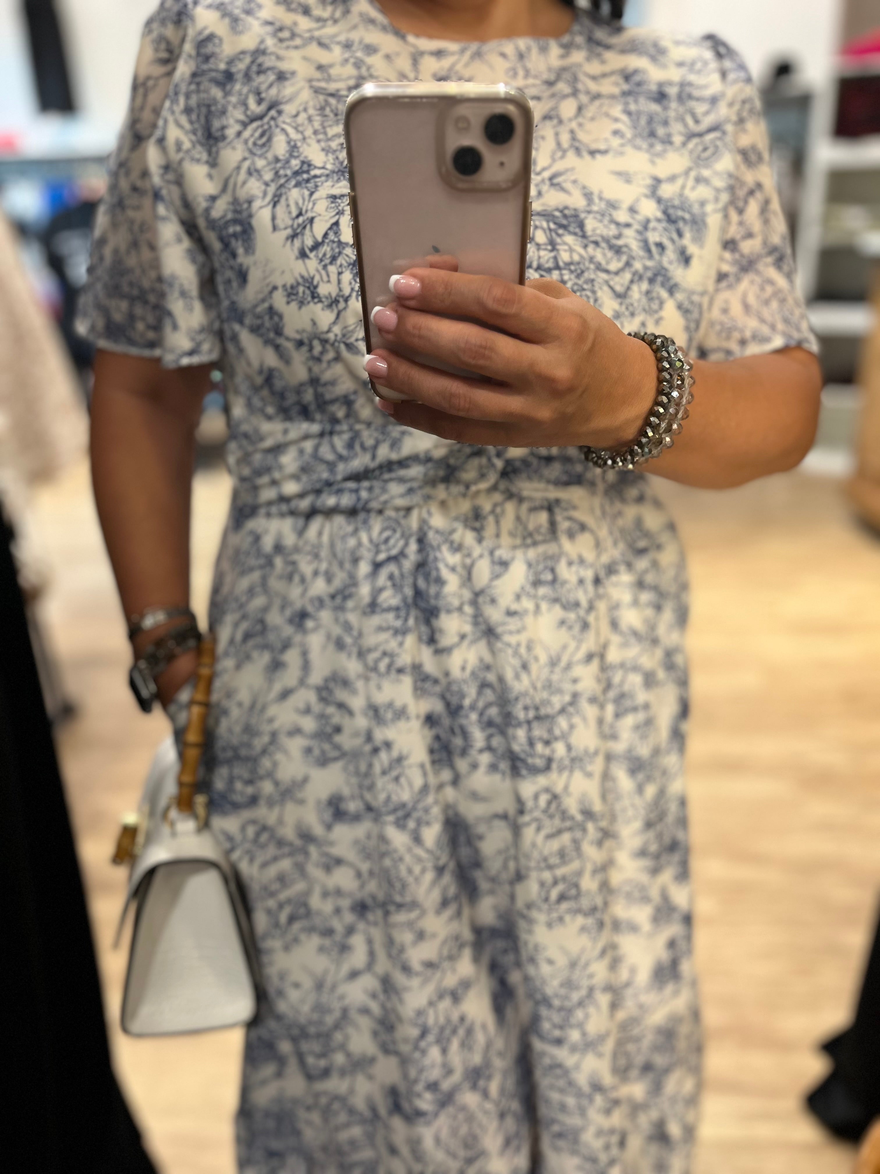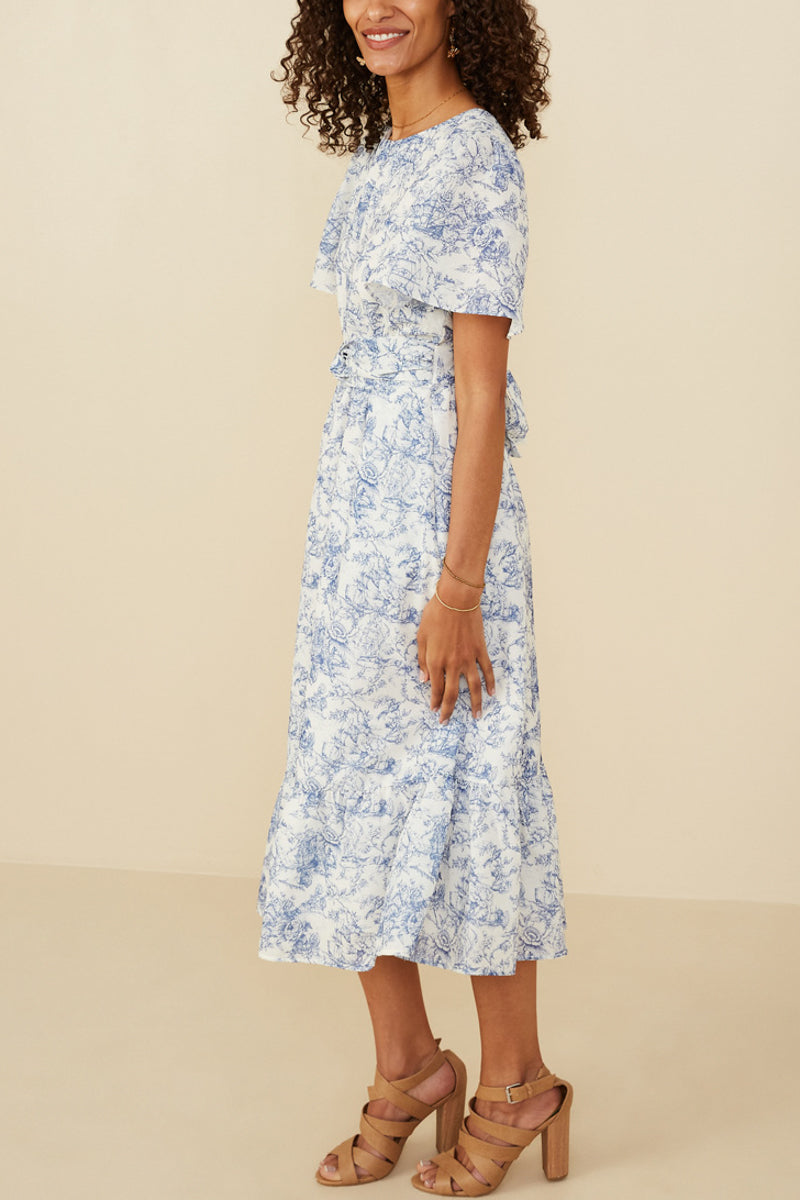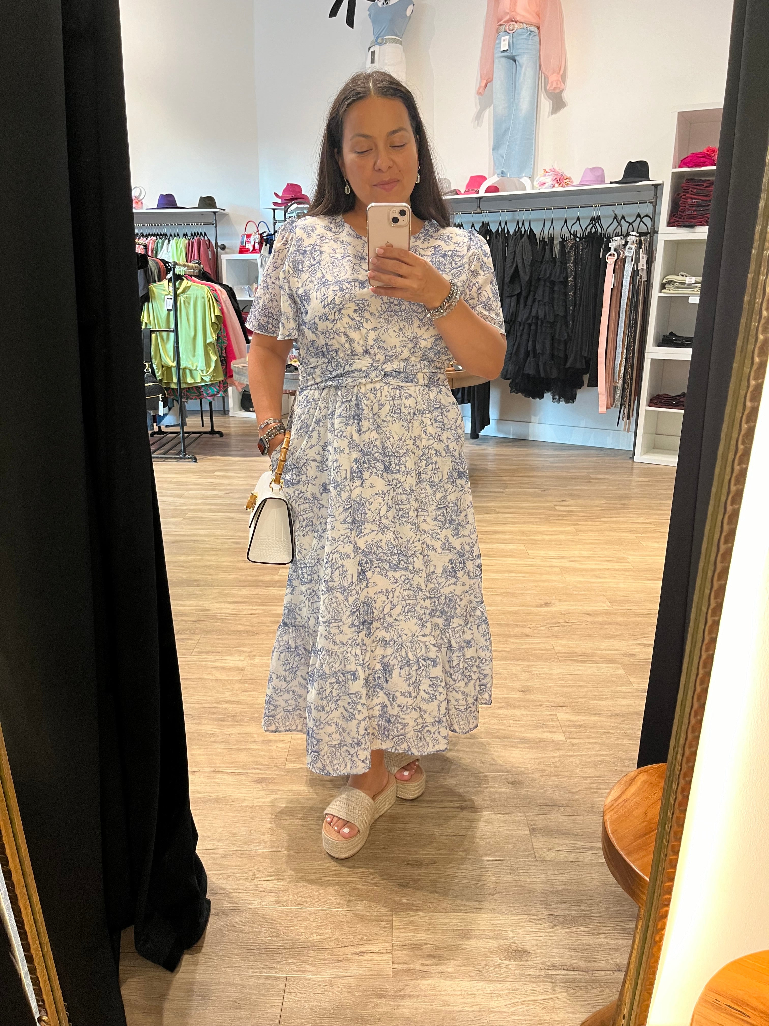 Effortlessly elegant, the Georgia Grace Dress exudes vintage charm with its antique floral print and maxi length. The feminine petal sleeves and twist waist tie add a touch of romantic sophistication, while the practical pockets and full lining make it both stylish and functional. Available in a chic white and blue color palette.