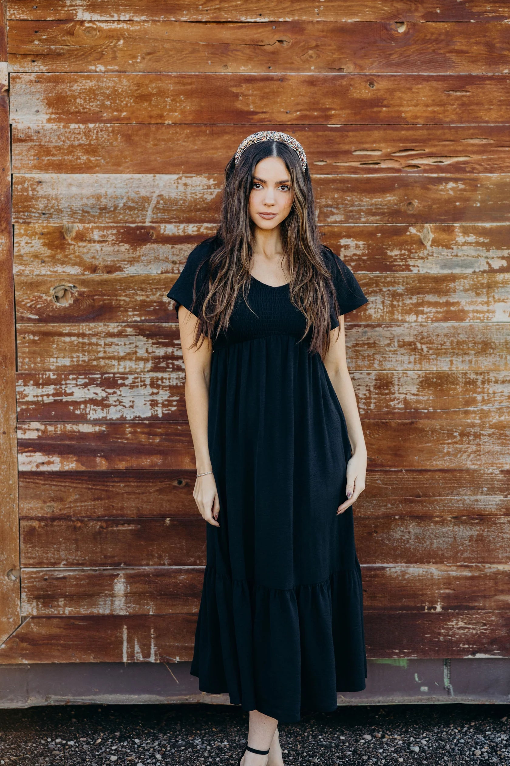 Introducing the Kendall Dress, a sophisticated and exclusive piece that exudes elegance. Crafted with black fabric, this maxi dress features a smocked bodice, flutter sleeves, and a flattering v neckline. With a ruffle hem and convenient pockets, this dress offers both style and practicality. Elevate your wardrobe with this luxurious and tasteful piece.