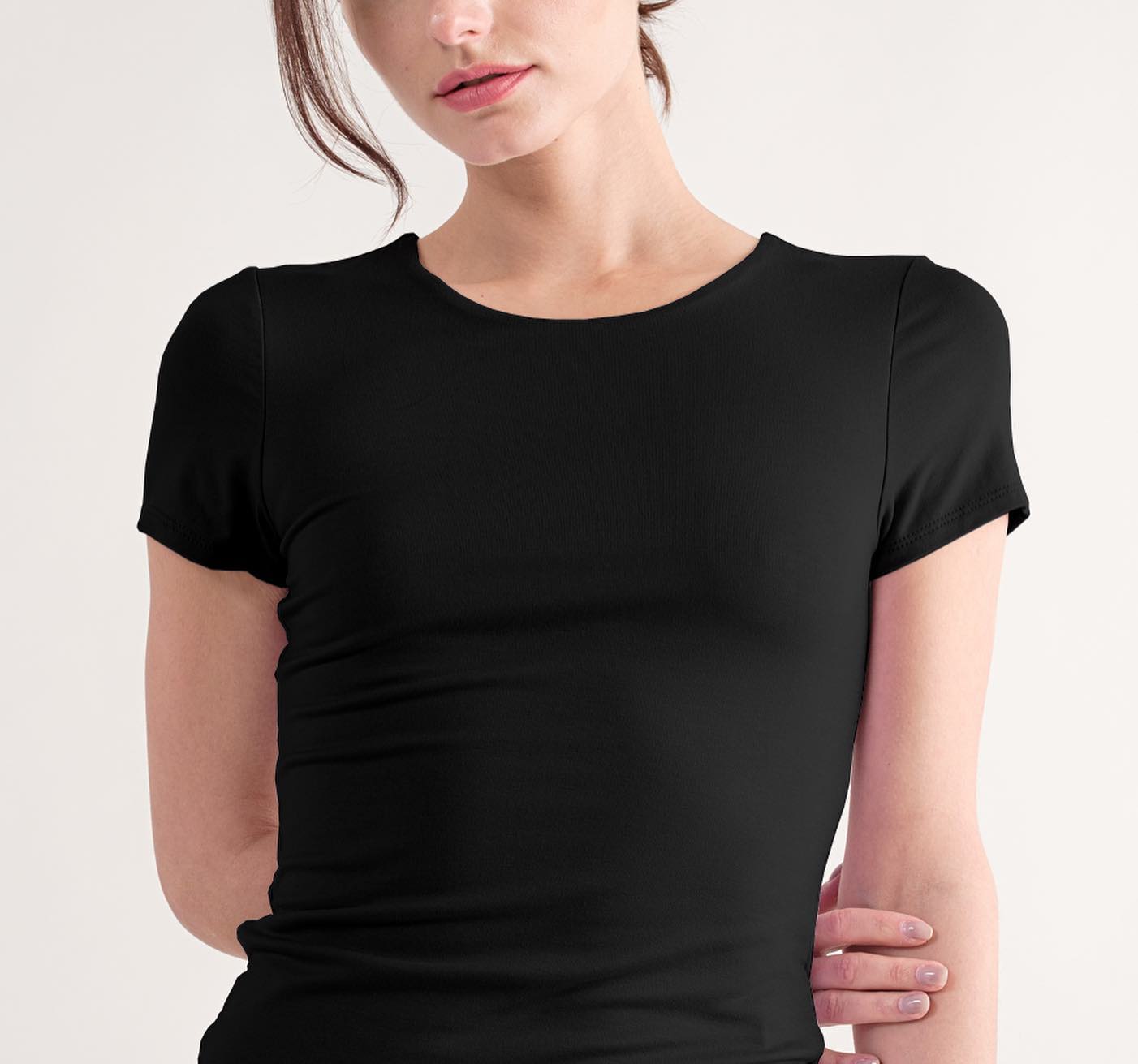 Discover the ultimate in comfort and support with this luxurious Black Round Neck Top. Crafted with a premium blend of yoga-friendly polyester and spandex, the top features a double layered design and strategically structured stomach support to ensure you experience maximum comfort during workouts. Its breathable short sleeves offer coverage while remaining lightweight and stretchy for an unrestricted range of motion. It's your essential piece for wearing under blazers, sweaters and pairing with skirts and pants!