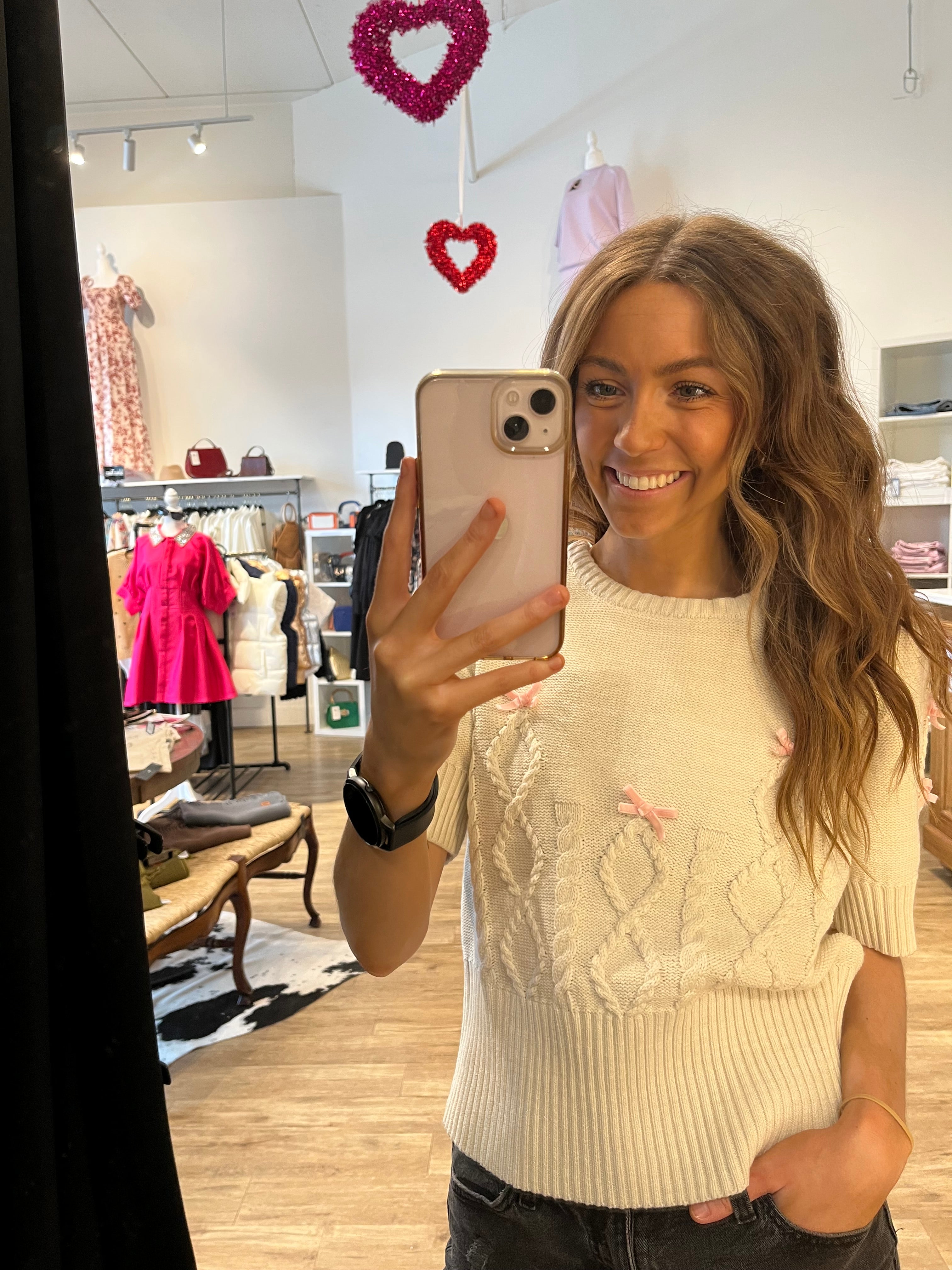Elevate your wardrobe with the Jamie Knit Sweater. Made from a luxurious cream knit and adorned with delicate pink bows, this short sleeve sweater exudes sophistication and elegance. Perfect for any occasion, it's a must-have for the fashion savvy.